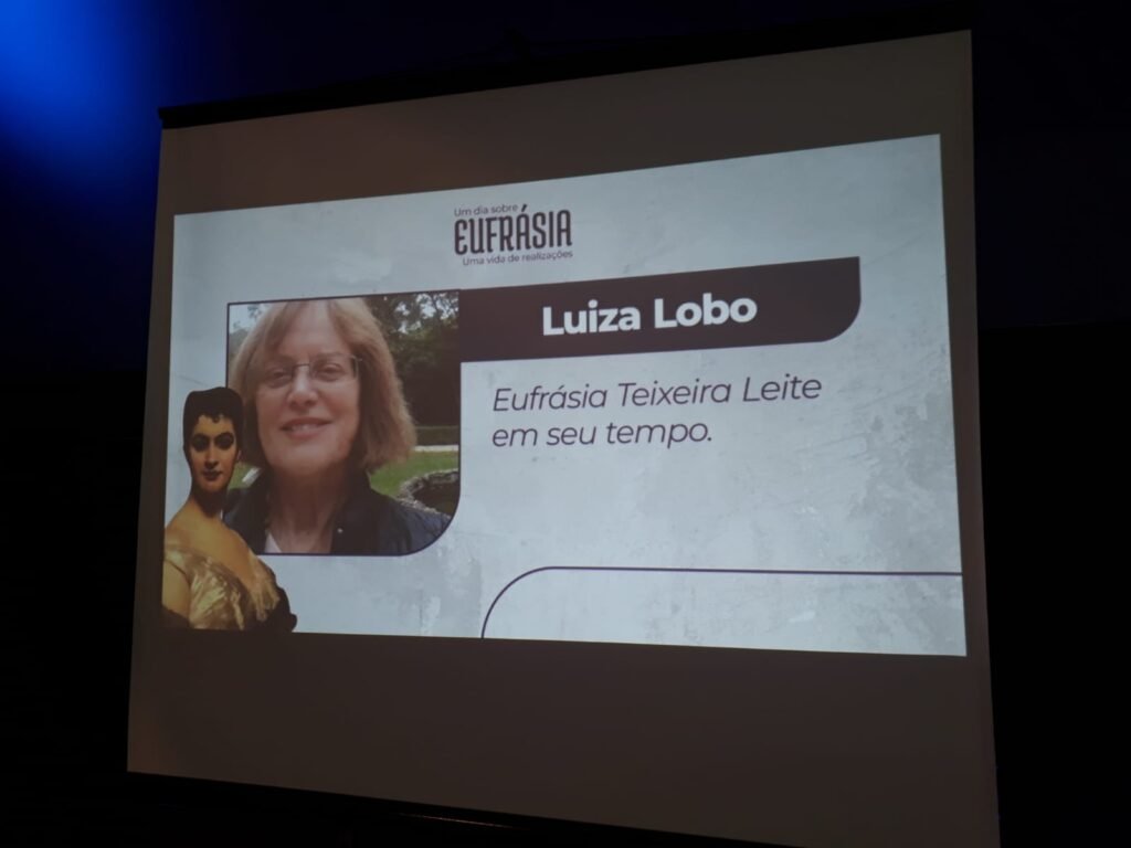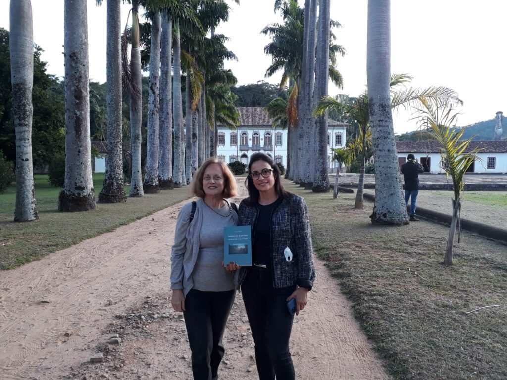 Luiza Lobo em palestra no Museu Casa da Hera em Vassouras no dia 27 de maio de 2022.Luiza Lobo ao lado de Simone Botelho, proprietária da fazenda Flores do Paraíso, RJ, tendo Fábrica de mentiras: do Vale do Café ao Arco do Triunfo (RJ, 7Letras, 2022), nas mãos.